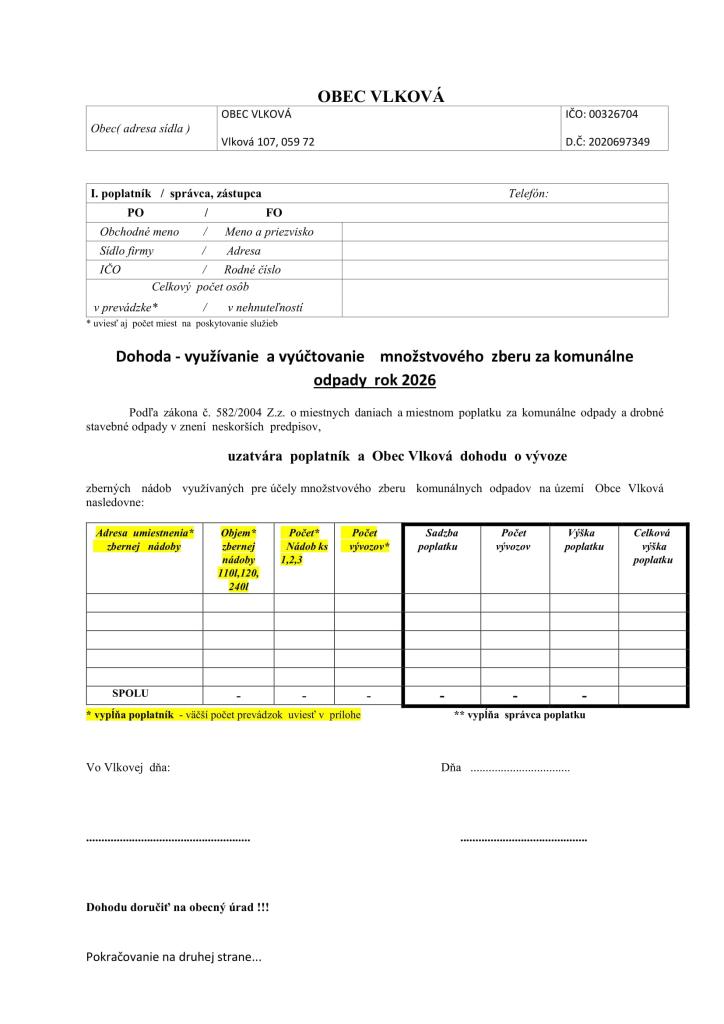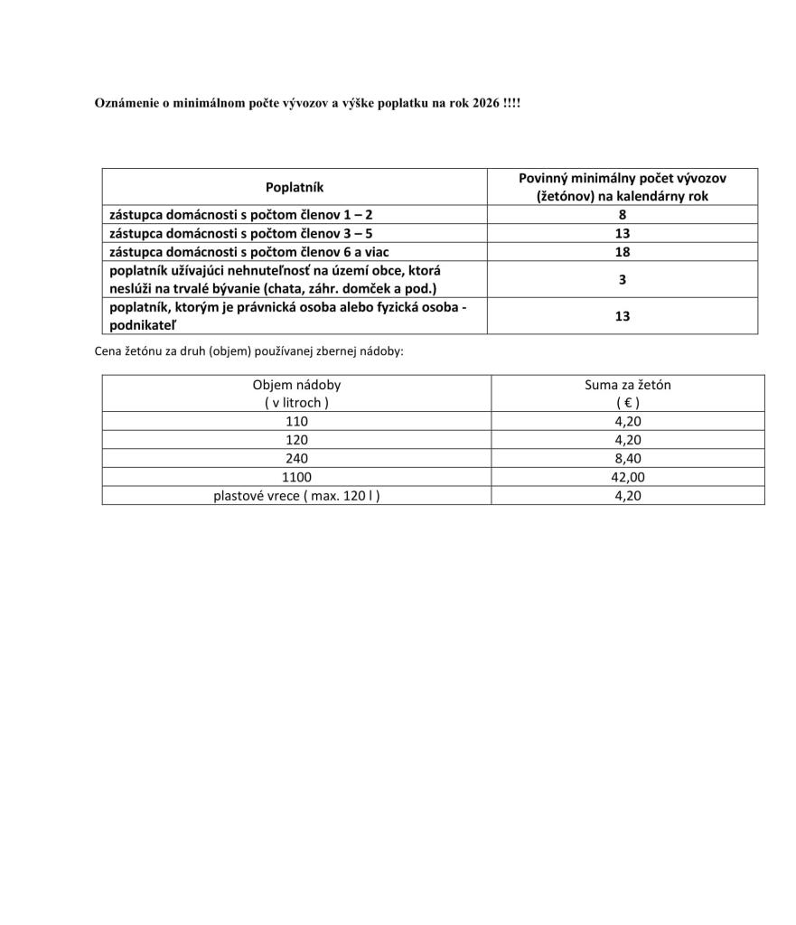Týmto žiadame občanov obce Vlková, ktorí si chcú zmeniť v roku 2026 objem zbernej nádoby (110 l ,120 l , 240 l ) alebo počet vývozov (žetónov) pri zbere komunálneho odpadu žetónovým systémom, aby túto skutočnosť nahlásili na obecnom úrade do 12.12.2025 doručením Dohody – využívanie a vyúčtovanie množstvového zberu za komunálne odpady na rok 2026 (osobne alebo emailom - oskenovanú a podpísanú dohodu obecvlkova@obecvlkova.sk).