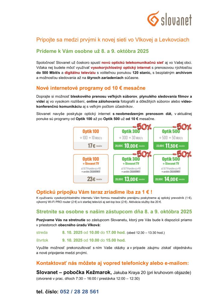 Oznam o novej optickej sieti v obci Vlková a Levkovce