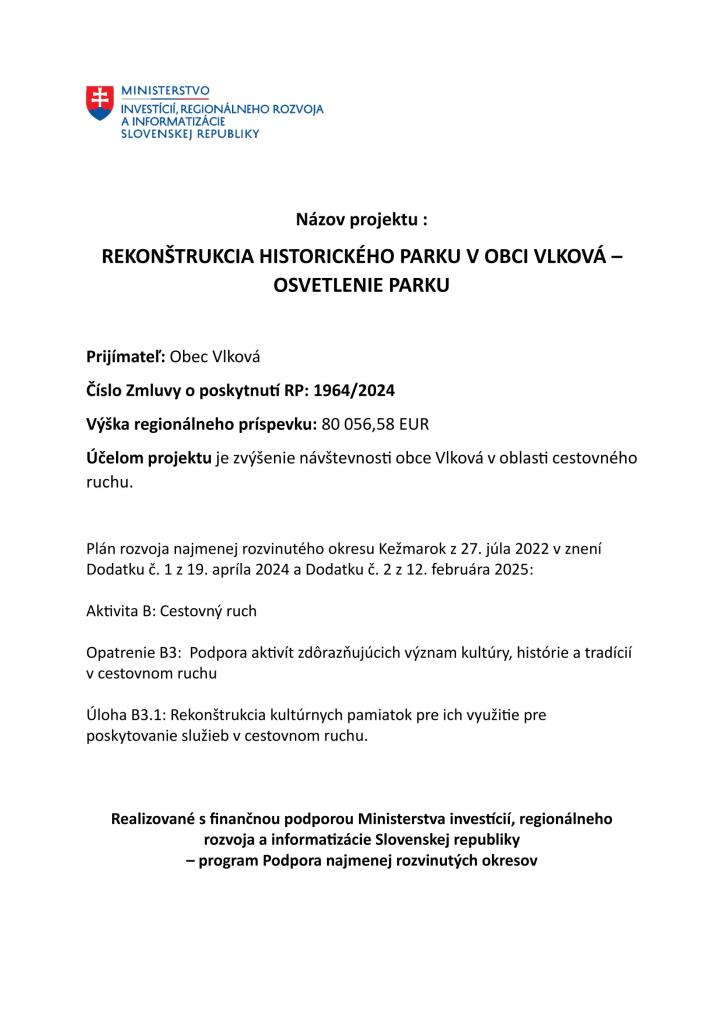 Účelom projektu je zvýšenie návštevnosti obce Vlková v oblasti cestovného ruchu.